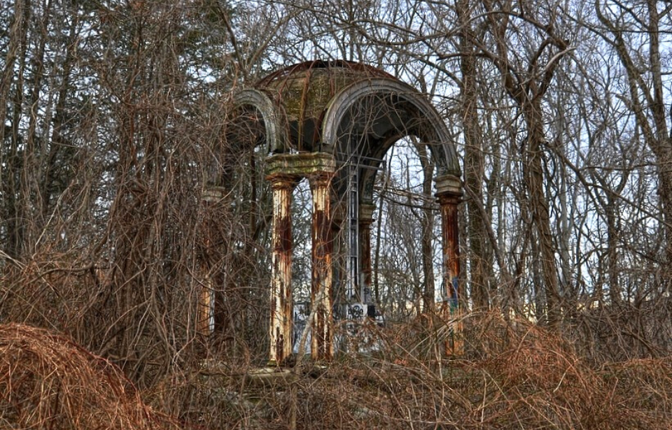 Eventually, the once-historic building fell into disrepair. On Halloween night in 1996, arsonists set the old building on fire, reducing it to rubble – except for one important landmark. Today, graffiti covers the walls of what remains. One specific gazebo is the source of local legends of ghosts and occult gatherings. The crumbling structure features a metal cross that has earned it the nickname of the “Hell House Altar,” which stands out against the haunting background of forest and ruins.