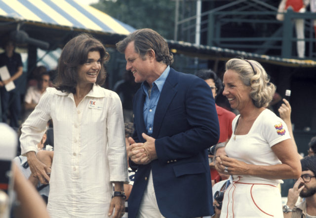 Jackie Onassis, Ted Kennedy, and Ethel Kennedy during RFK Pro Celebrity Tennis Tournament on August 23, 1975 at Forest Hills Stadium in New York City, New York, United States. (Photo Credit: Ron Galella / Ron Galella Collection / Getty Images)