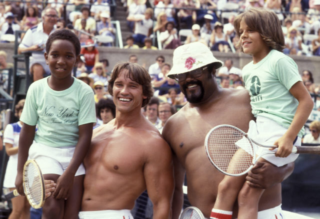 Arnold Schwarzenegger and Rosey Grier attend Sixth Annual Robert F. Kennedy Celebrity Tennis Tournament on August 27, 1977. (Photo Credit: Ron Galella / Ron Galella Collection / Getty Images)