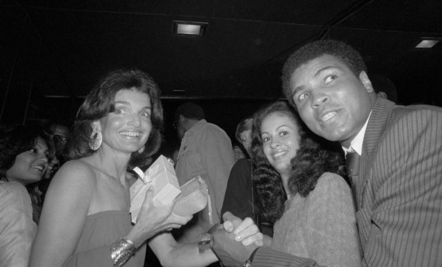 Jacqueline Kennedy Onassis greets world heavyweight boxing champ Muhammad Ali and his wife Veronica as they meet at a party at the Rainbow Room kicking off festivities for the Robert F. Kennedy Tennis Tournament. Proceeds from the 1977 charity affair went to underprivileged children. (Photo Credit: Bettmann / Getty Images)