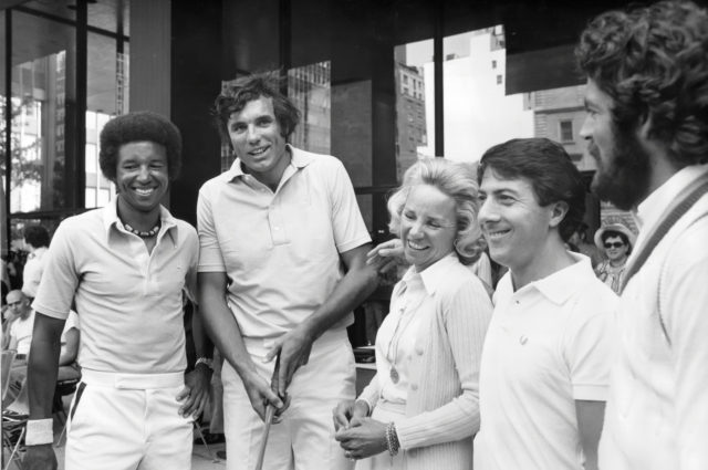 Arthur Ashe, Dave DeBusschere, Ethel Kennedy, Dustin Hoffman and Tom Gorman attends a promotional event on Park Avenue for the RFK Pro-Celebrity Tennis Tournament circa 1974 in New York City. (Photo Credit: PL Gould / IMAGES / Getty Images)