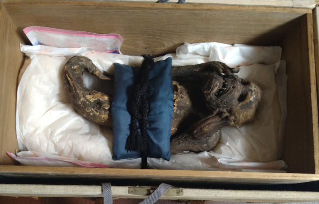 No one knows exactly when the mummy with the head of a human and the body of a fish came to be, but it has long been stored in a box with a memo that says it was caught in a fishing net off the coast of Kochi, Japan between 1736 and 1740. It was then brought to Osaka and was sold to the ancestor of Mr. Naojo Kojima, a member of the Bingo Fukuyama clan during the Edo period. The mermaid became a Kojima family heirloom until eventually, it ended up in the hands of the Enjuin temple.
