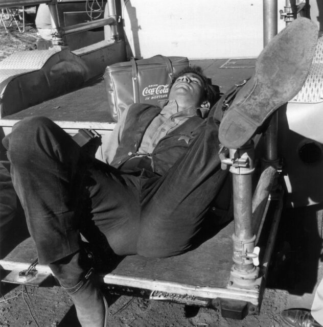 Actor Anthony Perkins is seen taking a much-needed rest, laying his head upon a Coca-Cola bag behind-the-scenes of the 1957 film, The Tin Star.