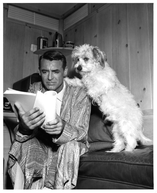 Cary Grant is seen reading through his lines for the 1953 romantic comedy, Dream Wife, accompanied by his fluffy friend who looks to be offering his support.