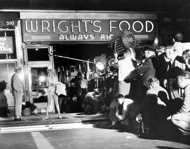 Here we see Marilyn Monroe performing her famous white dress scene from the 1955 film, The Seven Year Itch. The photo captures just how many people were watching as they filmed the shot.