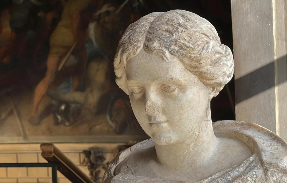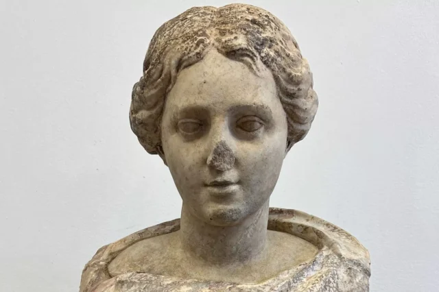 The marble statue depicts the neck and face of a woman with wavy hair and a neutral expression. It is also missing the tip of her nose.