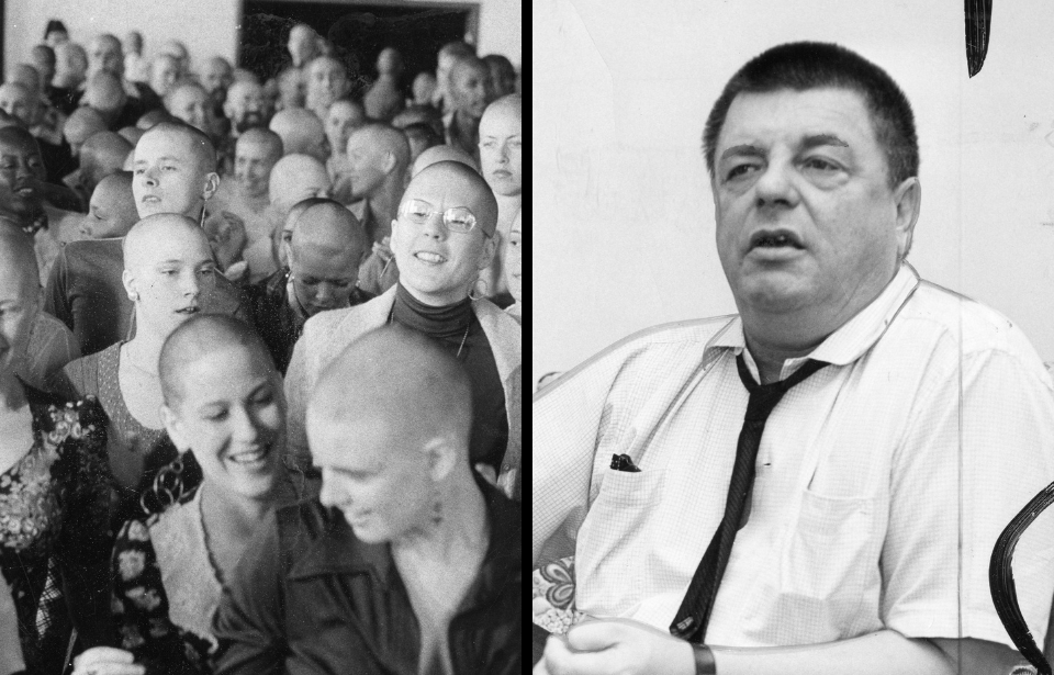 More than 500 women from Synanon communities throughout California went prematurely bald, shaving their heads. Here, some 200 Synanon women dance during a press conference. (Photo Credit: Bettmann / Getty Images)