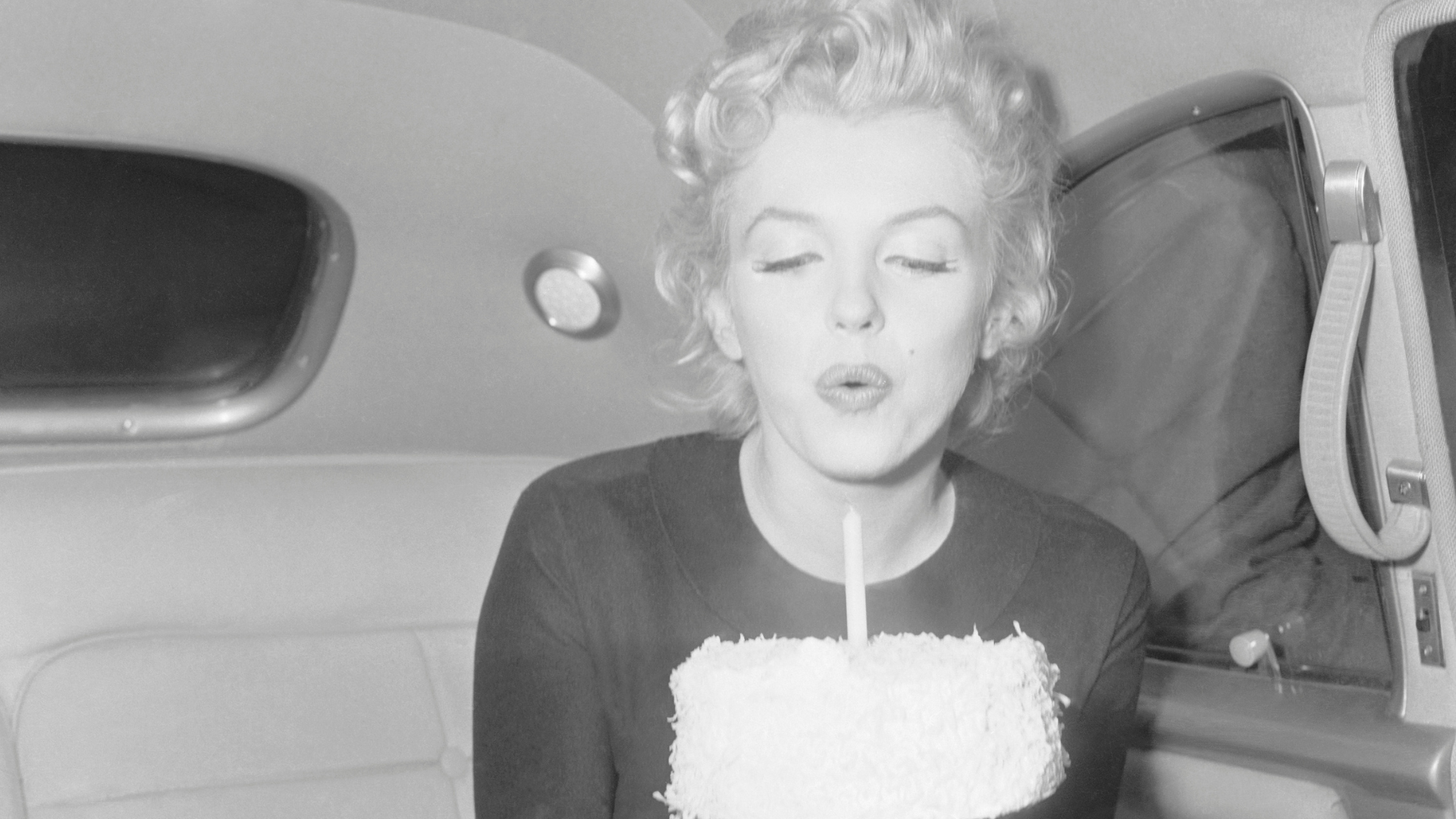 Here starlet Marilyn Monroe celebrates her 30th birthday by blowing out a candle on her cake.