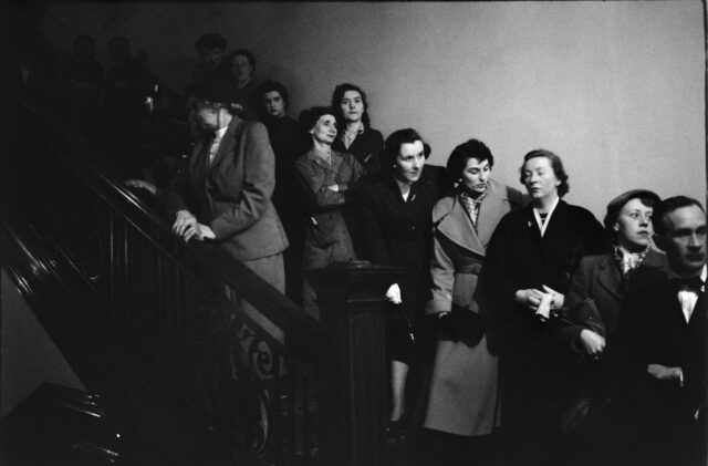 Here’s another image showing just how jampacked the 1955 Christian Dior fashion shows were. We’re feeling claustrophobic just looking at that crowd of people on the staircase… Give each other space, people!