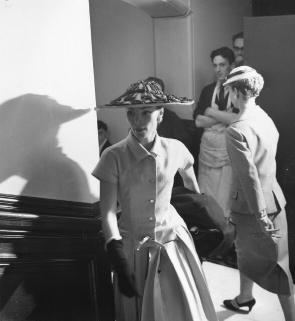 Christian Dior was very involved in his business, including the fashion shows, so it’s no surprise to see him with one of the models, ensuring her outfit looks as good as he designed it to be.