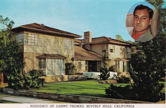 Vintage postcard featuring the large, yet simple mansion owned by jack-of-all-trades entertainer and philanthropist Danny Thomas.