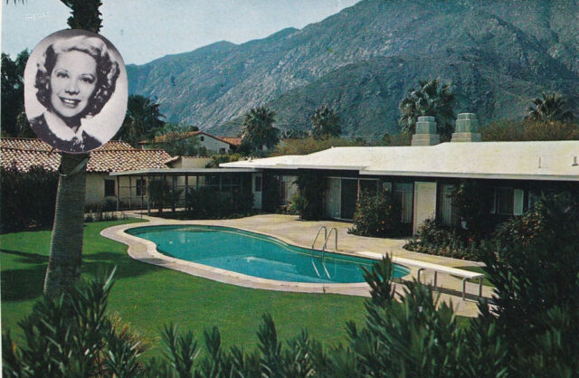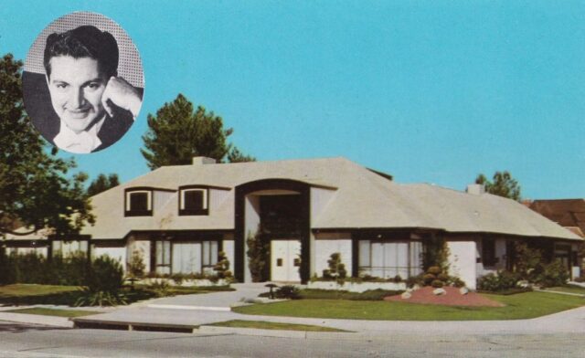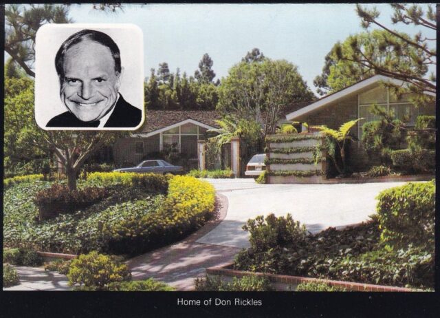 Vintage postcard featuring an image of funny man Don Rickles’ residence. It looks like someone had a green thumb.