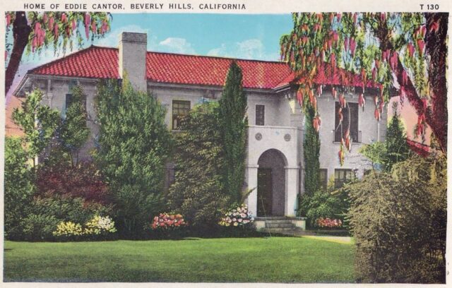 Vintage postcard featuring the mansion owned by comedian and actor Eddie Cantor.