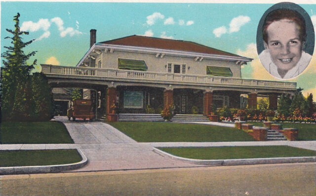 Vintage postcard featuring the mansion once inhabited by child star Jackie Coogan.
