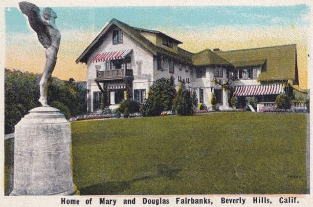 Vintage postcard featuring the grand estate known as Pickfair, which belonged to Mary Pickford and Douglas Fairbanks, Sr., prior to the couple’s divorce in 1936. Originally built for attorney Lee Allen Phillips, the property was sold to Fairbanks in 1918, and the press soon nicknamed it “Pickfair” after he and his then-wife.