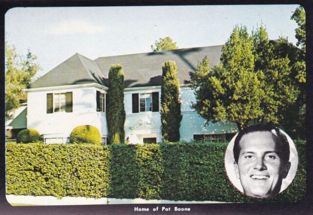 Vintage postcard featuring musician Pat Boone’s mansion, located within a gated community.
