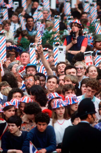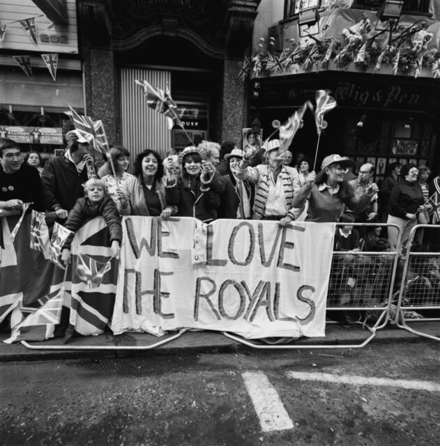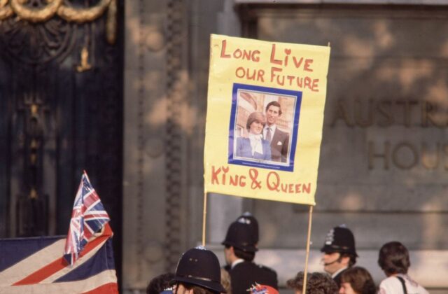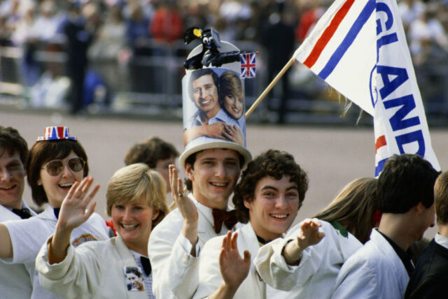 Waving British flags and standing with a banner that reads, “WE LOVE THE ROYALS,” it looks like this group of spectators were overjoyed to have had a front-row seat along the procession on the day of Diana and Charles’ wedding.