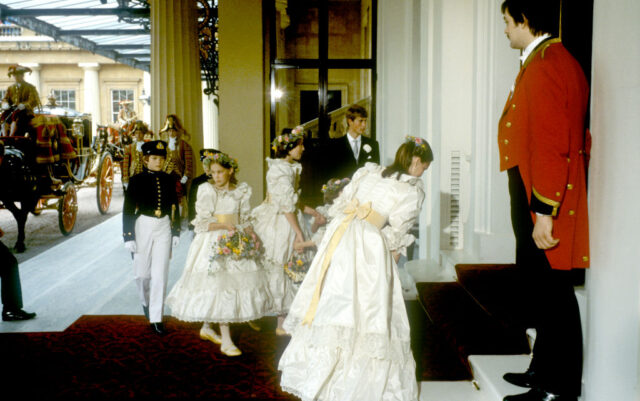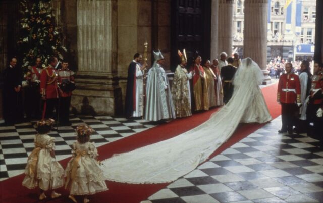 The train on Diana’s wedding dress was an impressive 25 feet long, so it’s no surprise she needed help with it to make sure it didn’t get caught on anything as she walked down the aisle at St. Paul’s Cathedral.