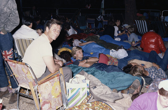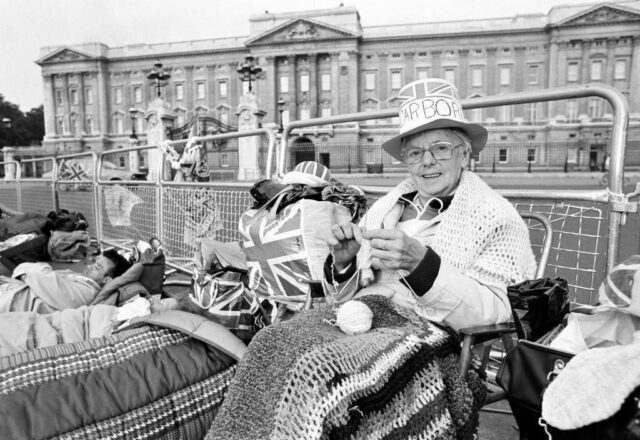 Some chose to take a nap to pass the time while they waited for Diana and Prince Charles, while others, like Kathleen Lucus, used the wait to catch up on some knitting. Here she is waiting outside of Buckingham Palace with other eager Royal Family fans.
