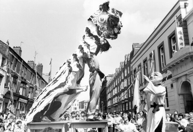 The celebrations extended far beyond the streets of London! This image shows a lion dancing troupe from Liverpool’s Chinese community putting on a performance, in honor of Diana and Prince Charles’ nuptials.