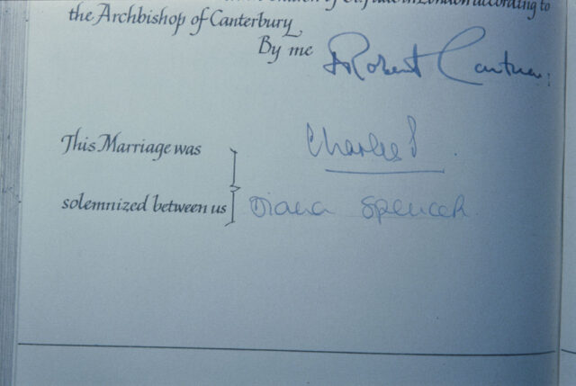 Here’s a close-up of the marriage register signed by Diana, Prince Charles and Robert Runcie at the wedding ceremony at St. Paul’s Cathedral.