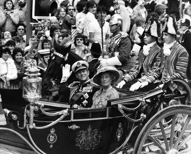 You didn’t think we’d leave out Prince Philip, did you? This image shows the late Duke of Edinburgh riding in a horse-drawn carriage with Diana’s mother, Frances Shand Kydd.