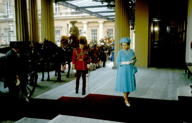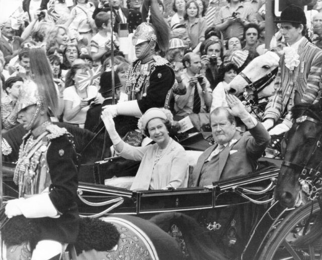 Never one to shy away from publicity, Queen Elizabeth II is seen here with Edward John, 8th Earl Spencer waving to the crowd of joyous spectators upon arriving at St. James’ Palace.