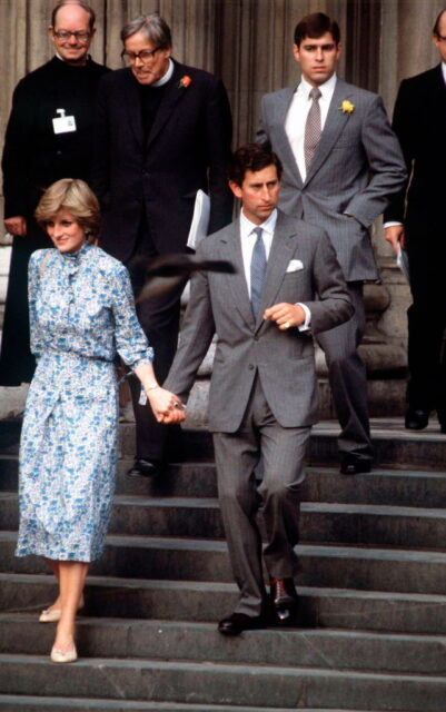 Here’s another look at the couple leaving St. Paul’s Cathedral following the rehearsal on July 27, 1981. Are those pre-wedding jitters we see on Diana’s face?