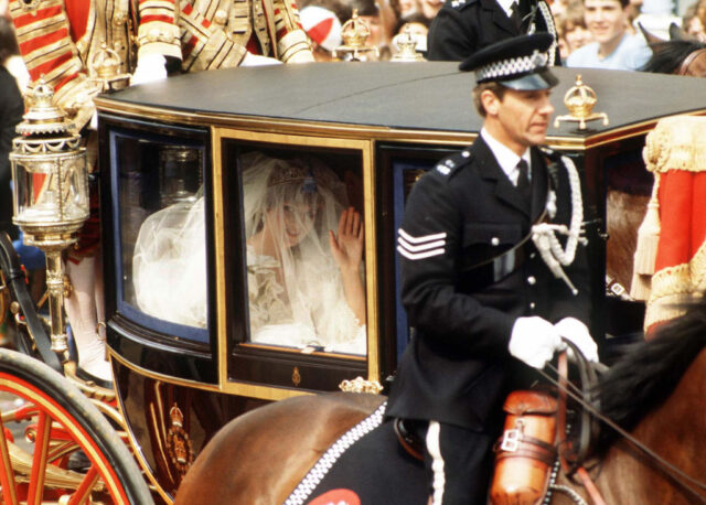 OMG, we’re finally at the big day! Here’s the soon-to-be Princess of Wales waving at spectators as she’s transported in a horse-drawn carriage. While the crowd couldn’t fully see her dress, the veil over her face gave them a hint at how extravagant it was.