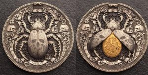 Incredibly Intricate Gold Bug with Mechanical Wings Carved onto Silver Dollars